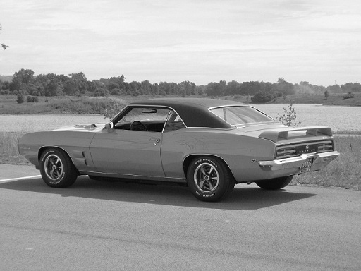 I do have dozens of factory original pics of various 69 Birds and 69 Trans Am's, but they're always on bias-ply tires. Since most of us have white lettered radials, what I did was make my color pic b&w to look like an original to show the stance.
