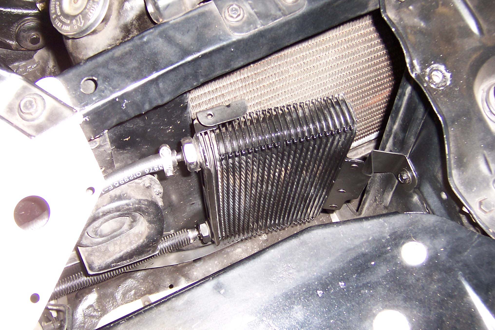 I discovered Ford trucks from the 90's are really nice units with brackets in the right places, if you can find a rust-free one, and I did in a 1993 Econoline van. About 11" x 7" x 2" thick, nice heavy aluminum cross-flow plate construction (like the B & M Supercoolers), without the flimsy aluminum fins of the cheapos, and real nice integrated brackets that lined up nicely with my F-bird's center support and radiator support after some gentle bending.