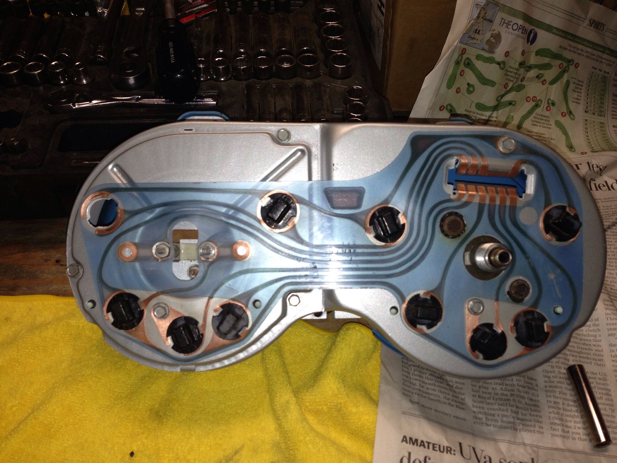 I found the best way to trouble shoot the dash bezel is with the schematic in front of me along with a 9 volt battery, a bunch of alligator clips and a 90 ohm Potentiometer.