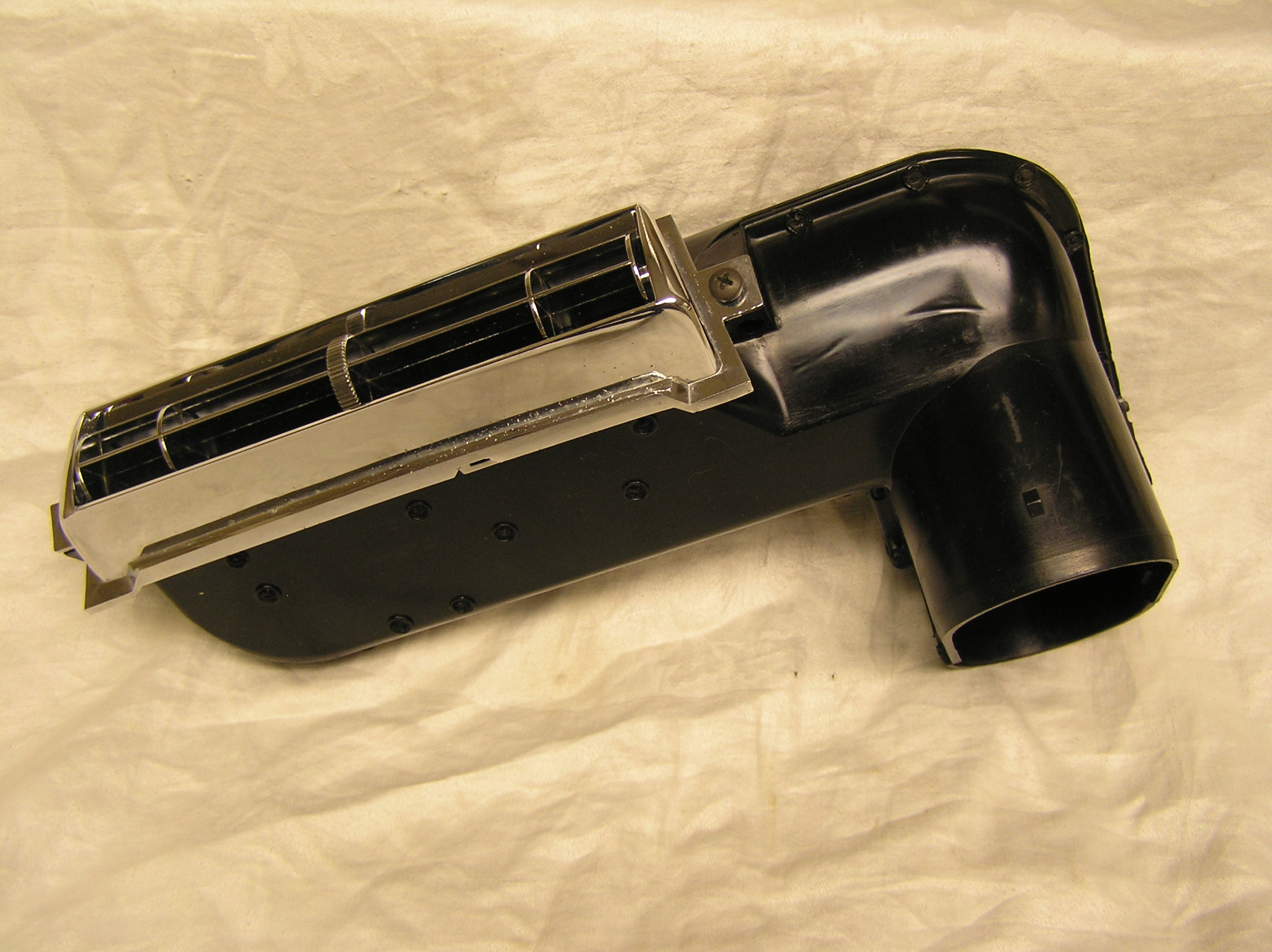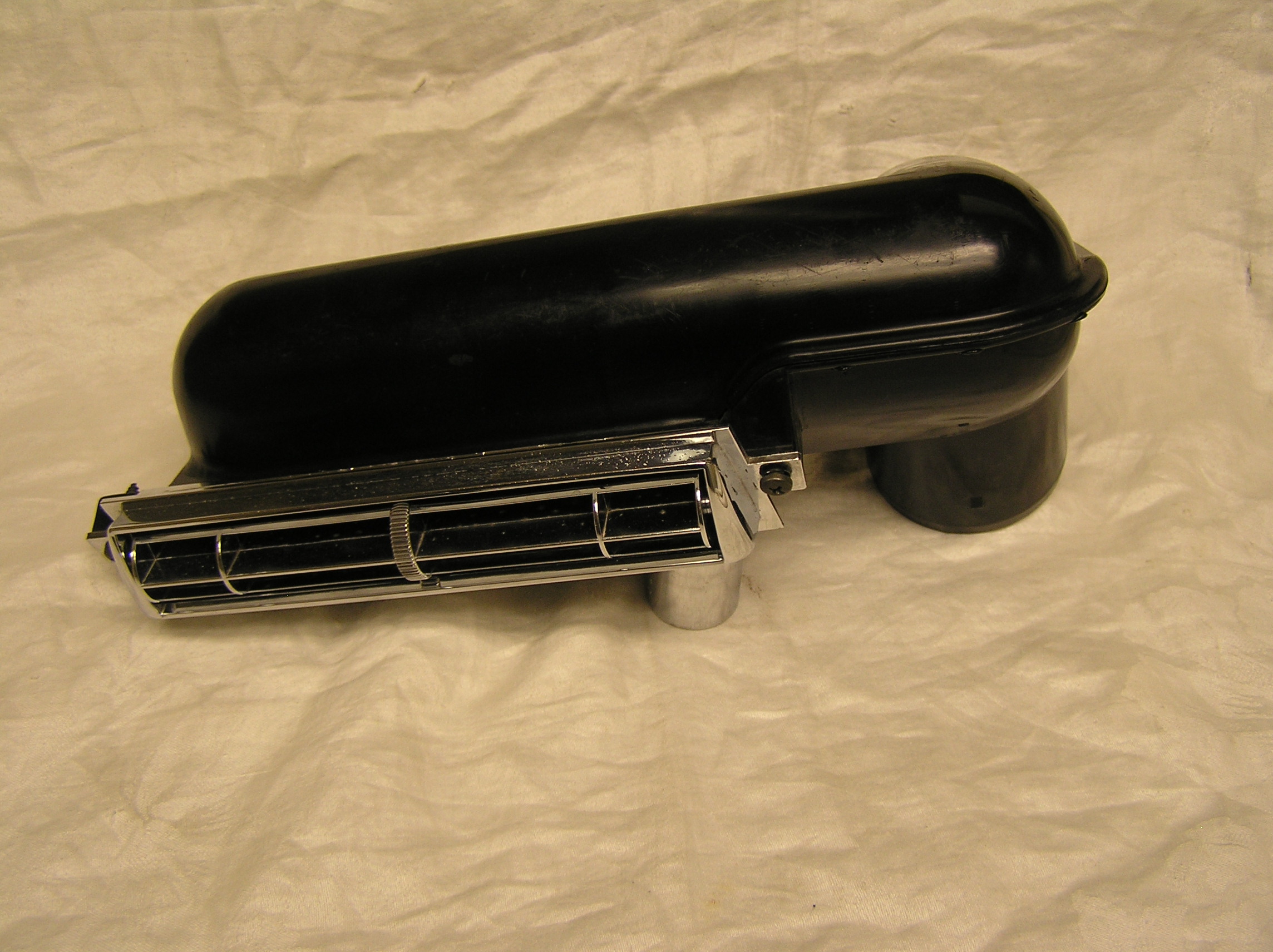 Original 1967-68 upper AC center dash duct with chrome vent assembly. This assembly is complete with new felts installed to keep the center chrome vent in it's desired position when adjusted. I had to repair one cracked mounting area with gorilla glue as seen in the last picture. Repair is solid with no problems. I meticulously cleaned and polished the chrome vent and bezel assy. Chrome vent and bezel is in great shape with minimal pitting. $115.00 plus shipping. 413-262-3445,Jim.