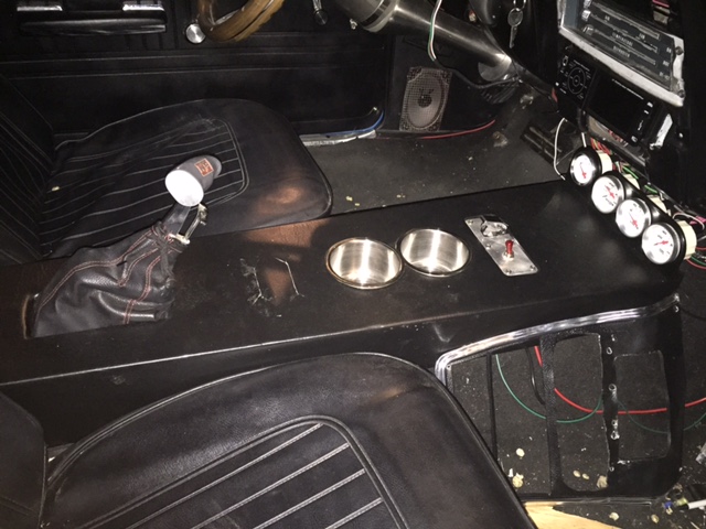 I'll post some picts after I take a few. If you build a custom console, it really doesn't take long. I built this in about 2 hours with scrap from the basement. I post a few picts in after I get them off my phone. Added the picts.. A few things.. This is in the midst of being 100% rewired to fix all the nonsense that was 100% wrong. All the wires won't stay where they are. The two holes in front of the shifter are for Cell phones, I am awaiting the charging mounts. The bases are done in brushed aluminum (simply bent and bolted). Switches on the console are there for the time being, as I haven't been able to map all the wiring, only about 60%. But, the switches will go. One is master power and one is fuel pump. I need to add an electronic switch to shut the pump off when the oil pressure goes to zero. Also, the cup holders were labeled as 3.5" ID, but they were 3 5/8" ID, so I had to use a dremel to widen the holes. If they were the correct size, they'd be straight.