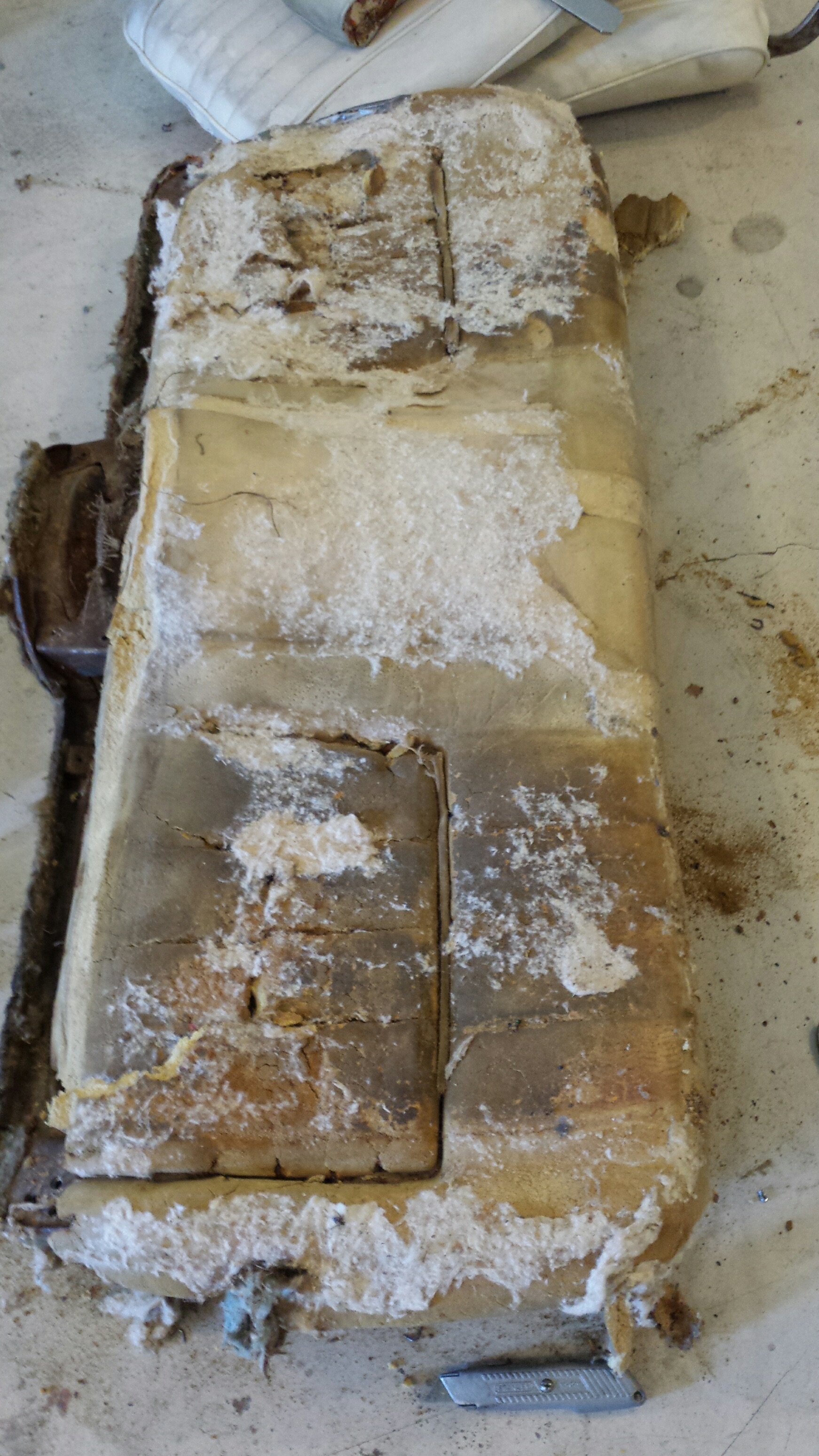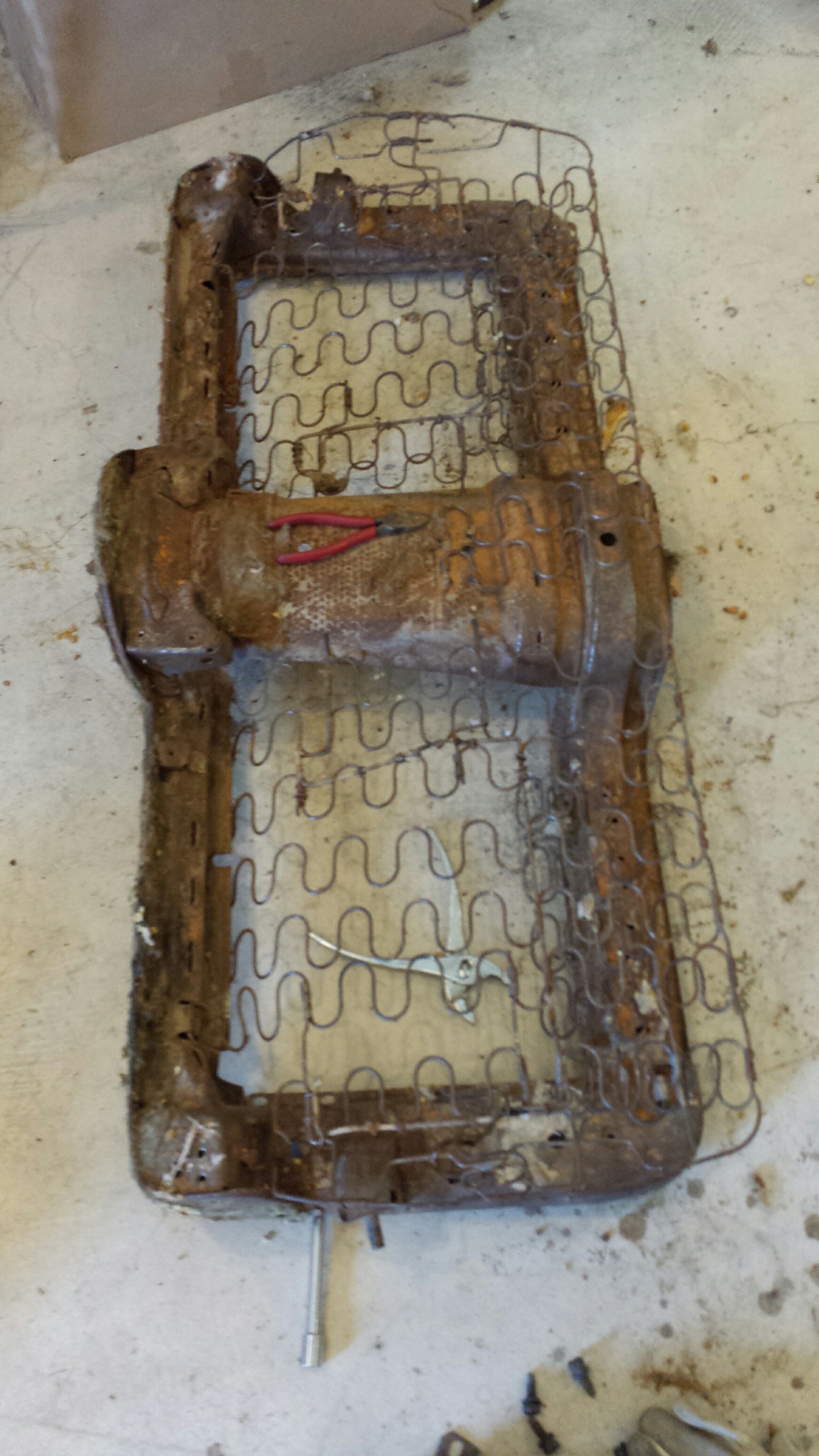 Started the tare down of my front and rear seats, will blast them and replace a few springs. Seems to be very weak under driver ars, this was one of the dirtiest jobs I've done, with all the mouse crap and nests they had built. These seats haven't been sat in for decades. Most people haven't seen a split bench or the inner parts, and in one pic is what's left of the broadcast sheet that was under the passenger side bench seat but unfortunately has little left of it. I need to try to find a few parts for this if anyone has an idea, I think there are covers on the sides of the armrest to cover the hinges and need to figure what to do with the crappy worn out headrest. I have new deluxe parchment covers but will need to get all new padding
