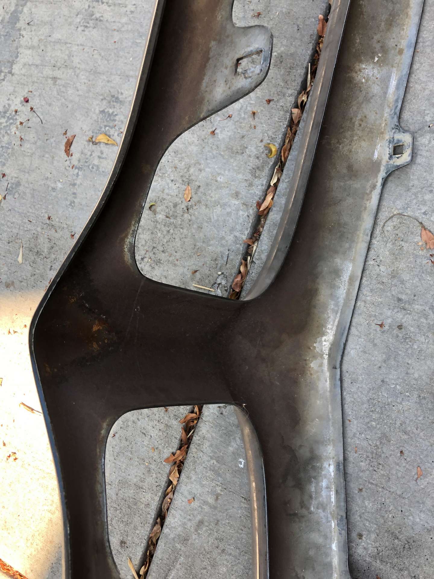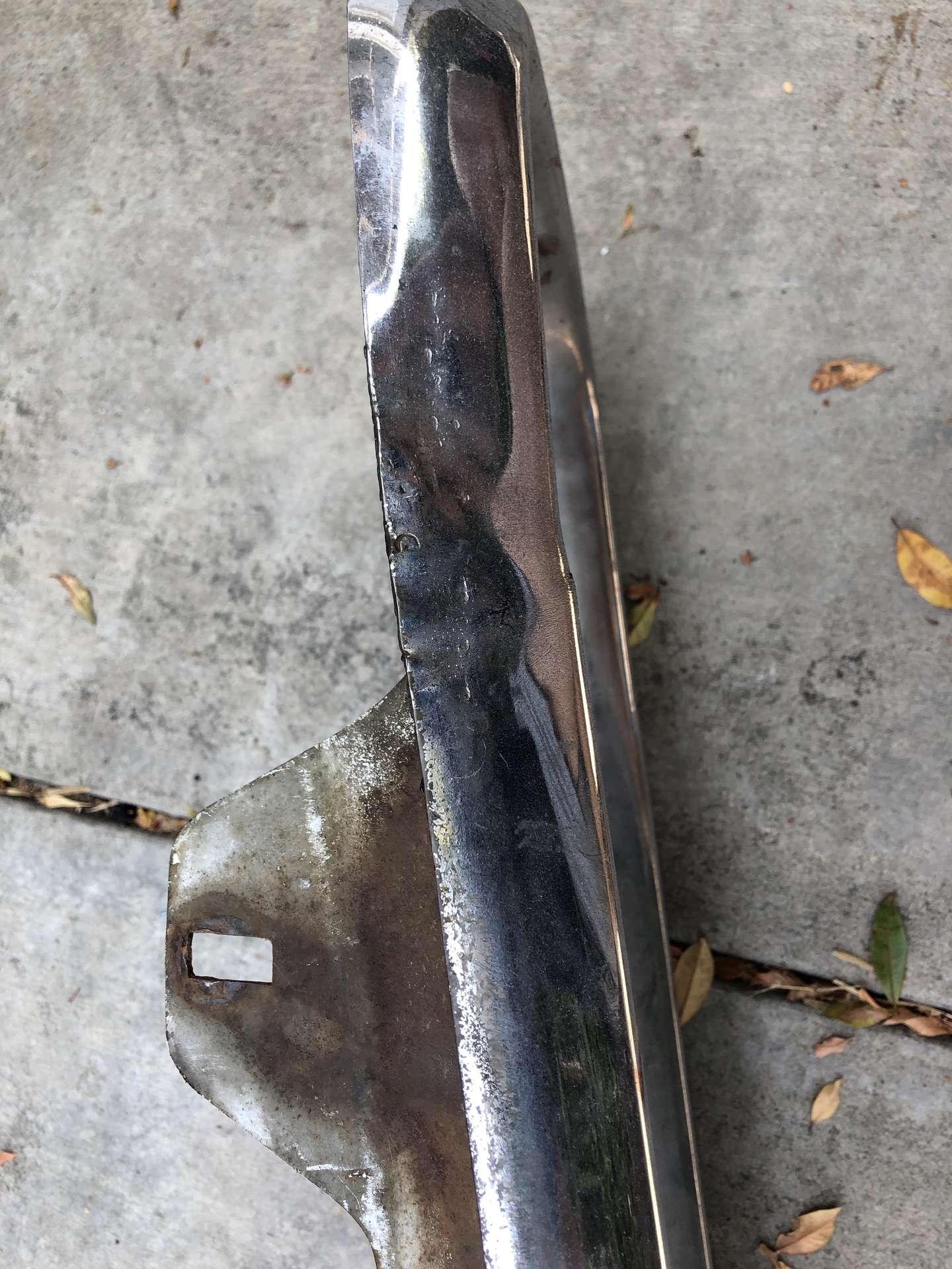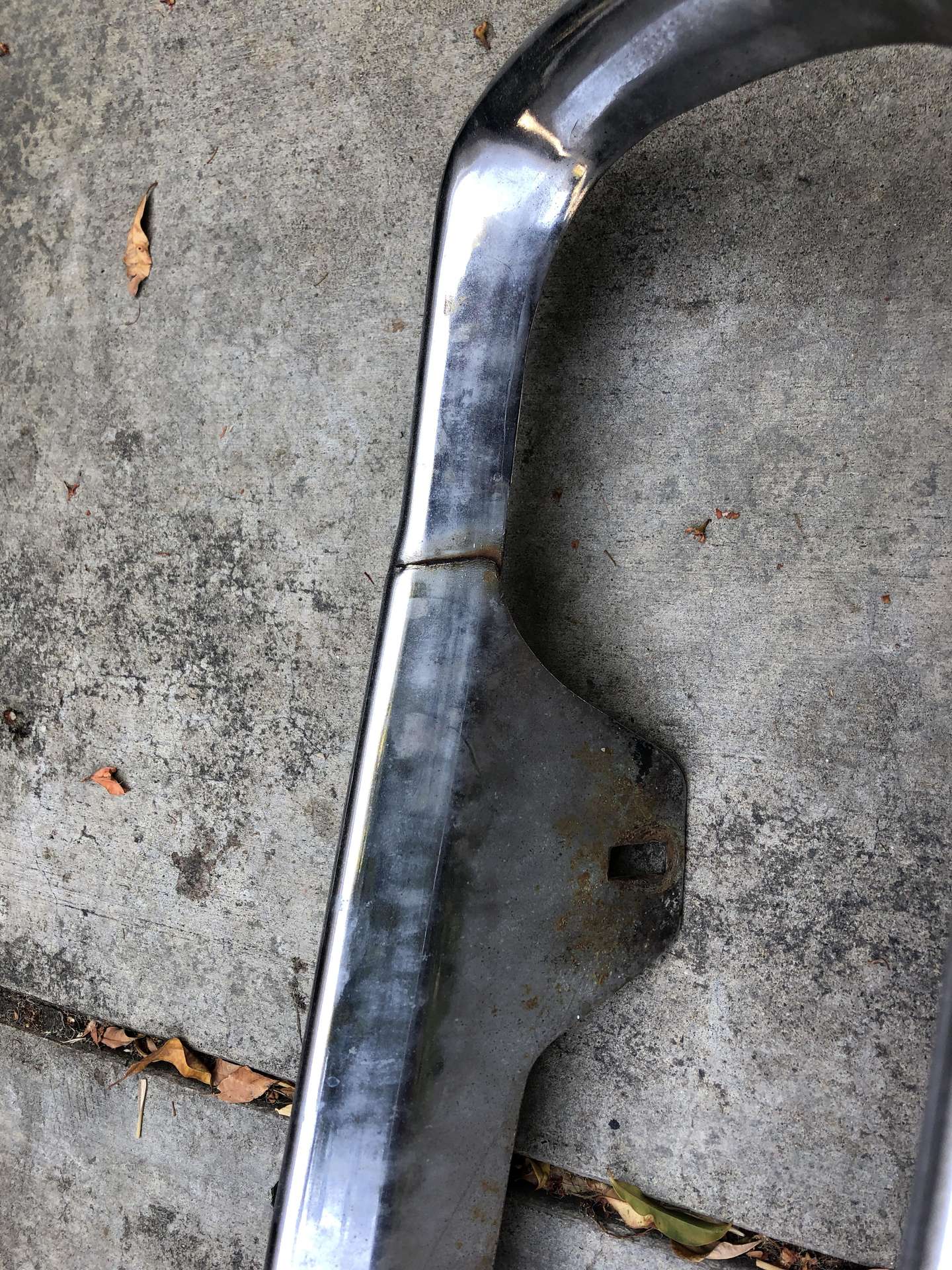 On the passenger side you can see it's bent and is cracked. The chrome looks fine to me. Back side you can see surface rust but there's no pitting anywhere. Mounts all look fine.