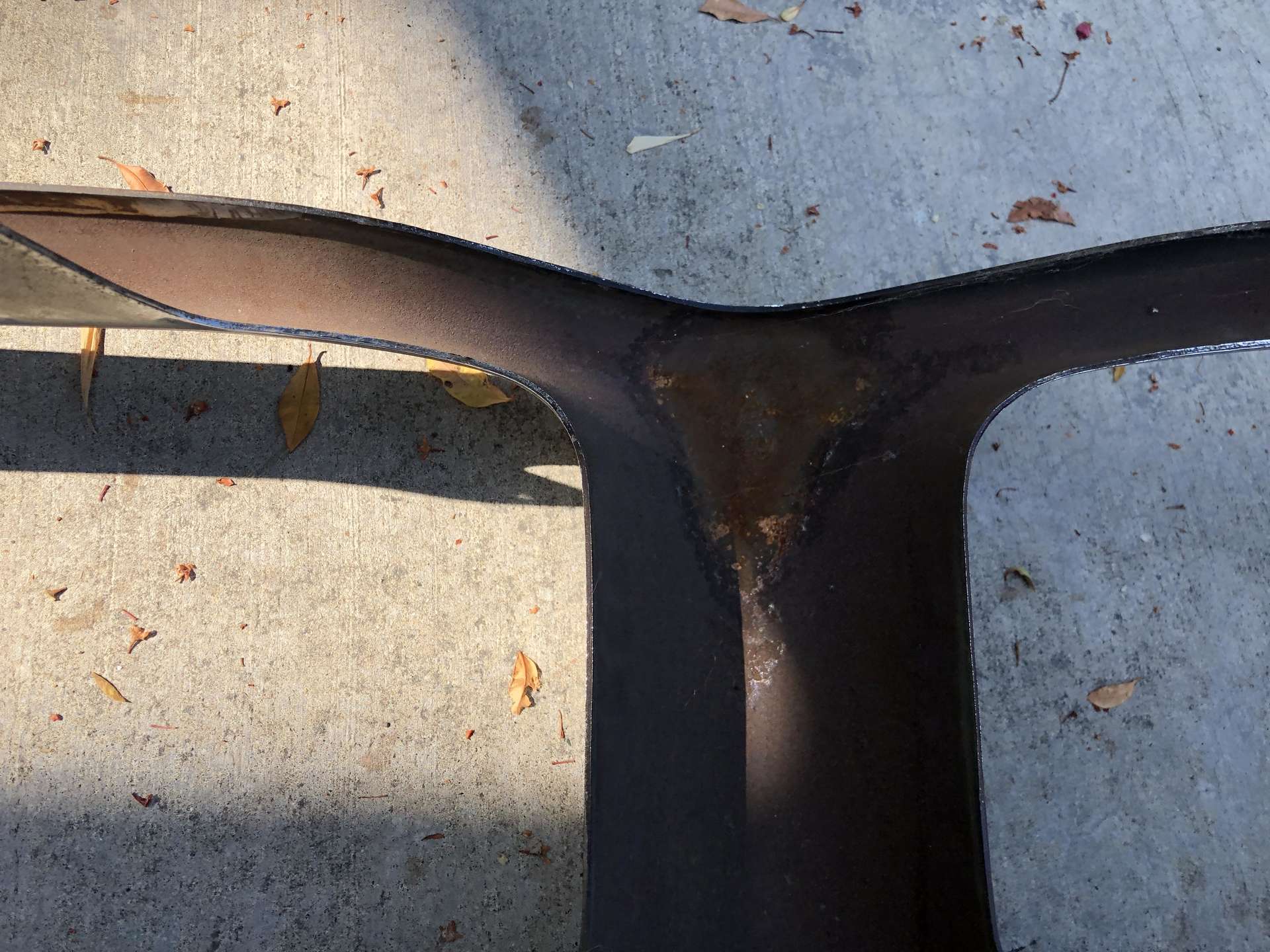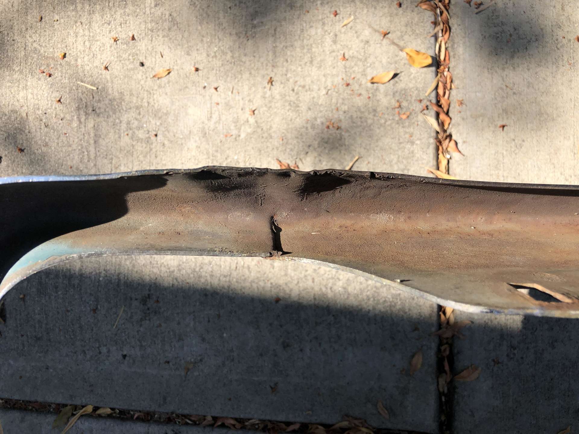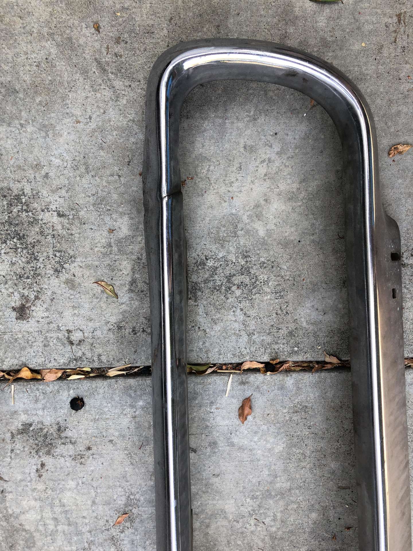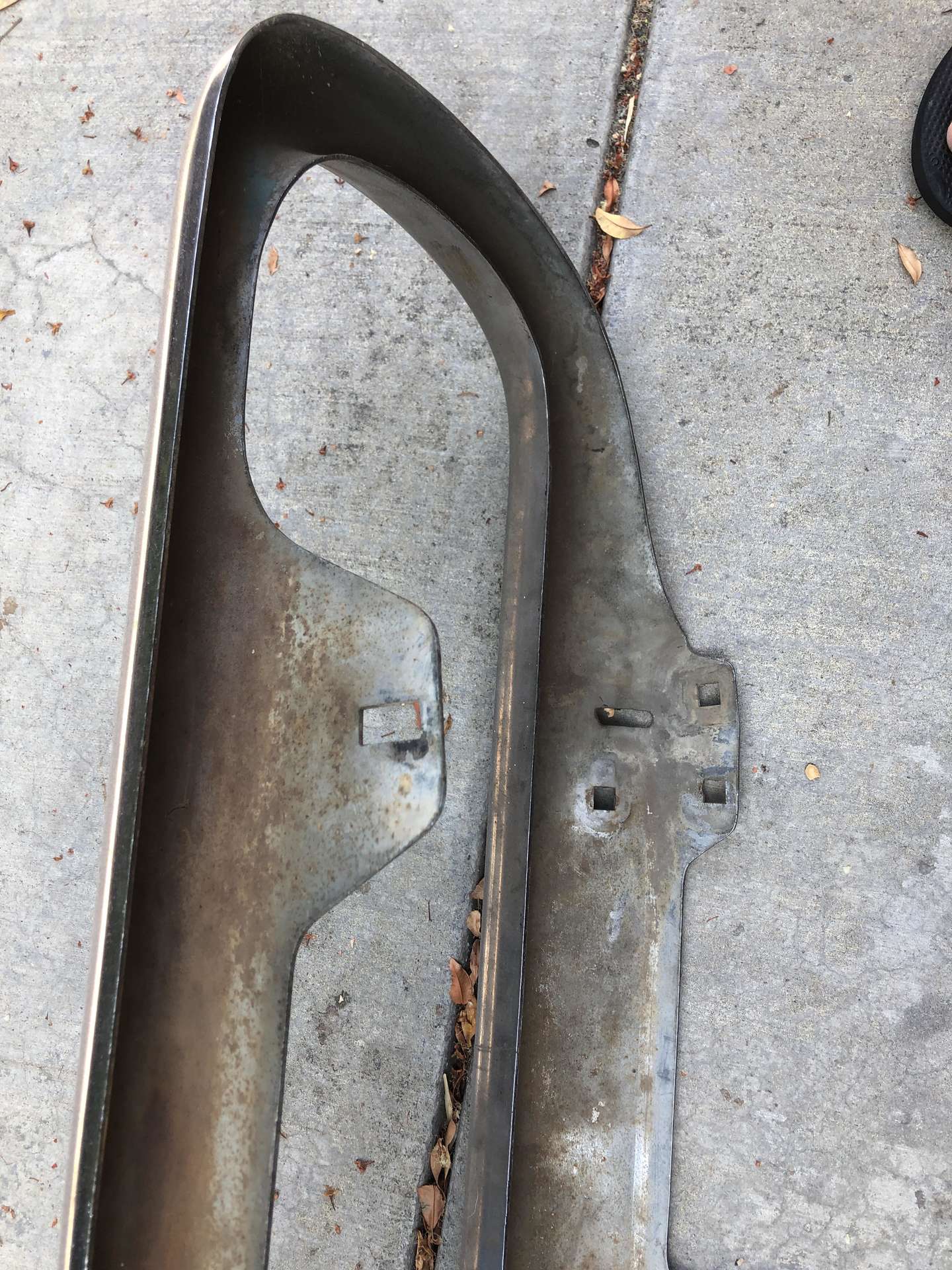 On the passenger side you can see it's bent and is cracked. The chrome looks fine to me. Back side you can see surface rust but there's no pitting anywhere. Mounts all look fine.